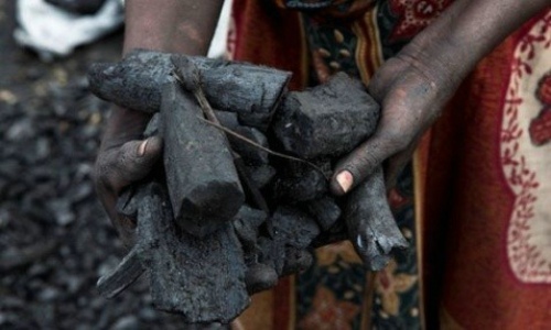 图:在刚果(金)首都金沙萨(Kinshasa),一名女子在自由市场上展示她手中的木炭。