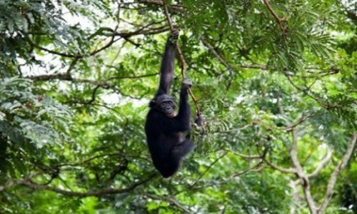 图:在金沙萨附近的刚果侏儒黑猩猩保护区(Congo Bonobo's Sanctuary),一只侏儒黑猩猩在树枝间摇曳。该保护区有60只灵长类动物,其中大多数是在父母被猎人打死后被带到保护中心。