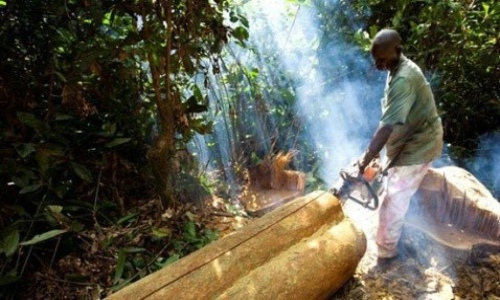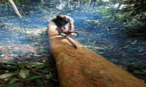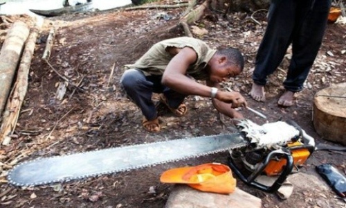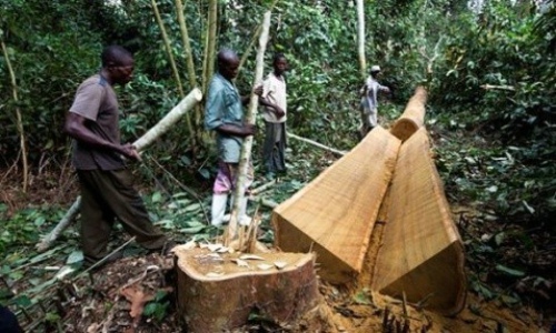 图:樵夫正在砍伐非洲红豆木,一种非常受欢迎的硬木木材