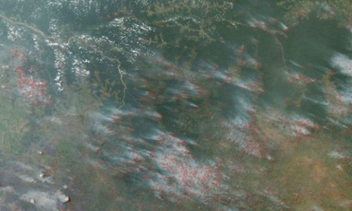 图:广泛的农业烧荒活动在非洲的旱季是很普遍的。这张图片显示了刚果(金)的开赛(Kasai)地区有数百处仍在继续的火灾(红色标记)。桑库鲁(Sankuru)和开赛河(Kasai River)之间深绿色的区域是热带森林。